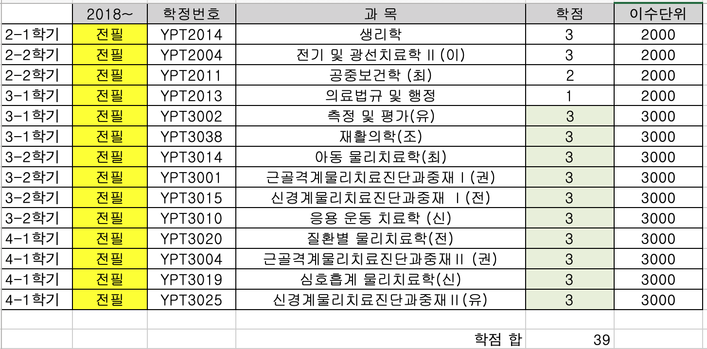 • 해당과목: 본 학과 2학년 전공필수과목 (생리학, 전기광선치료학 II, 공중보건학) 및 "의료법규"