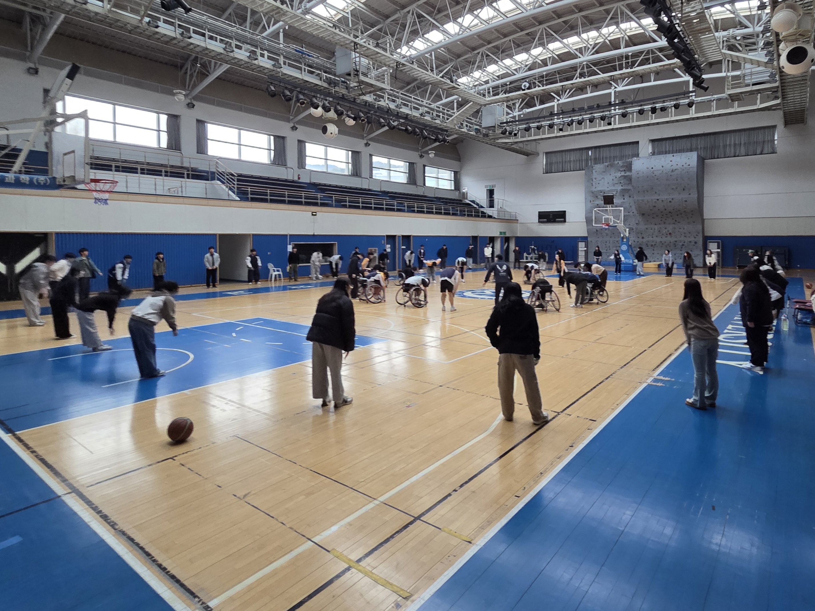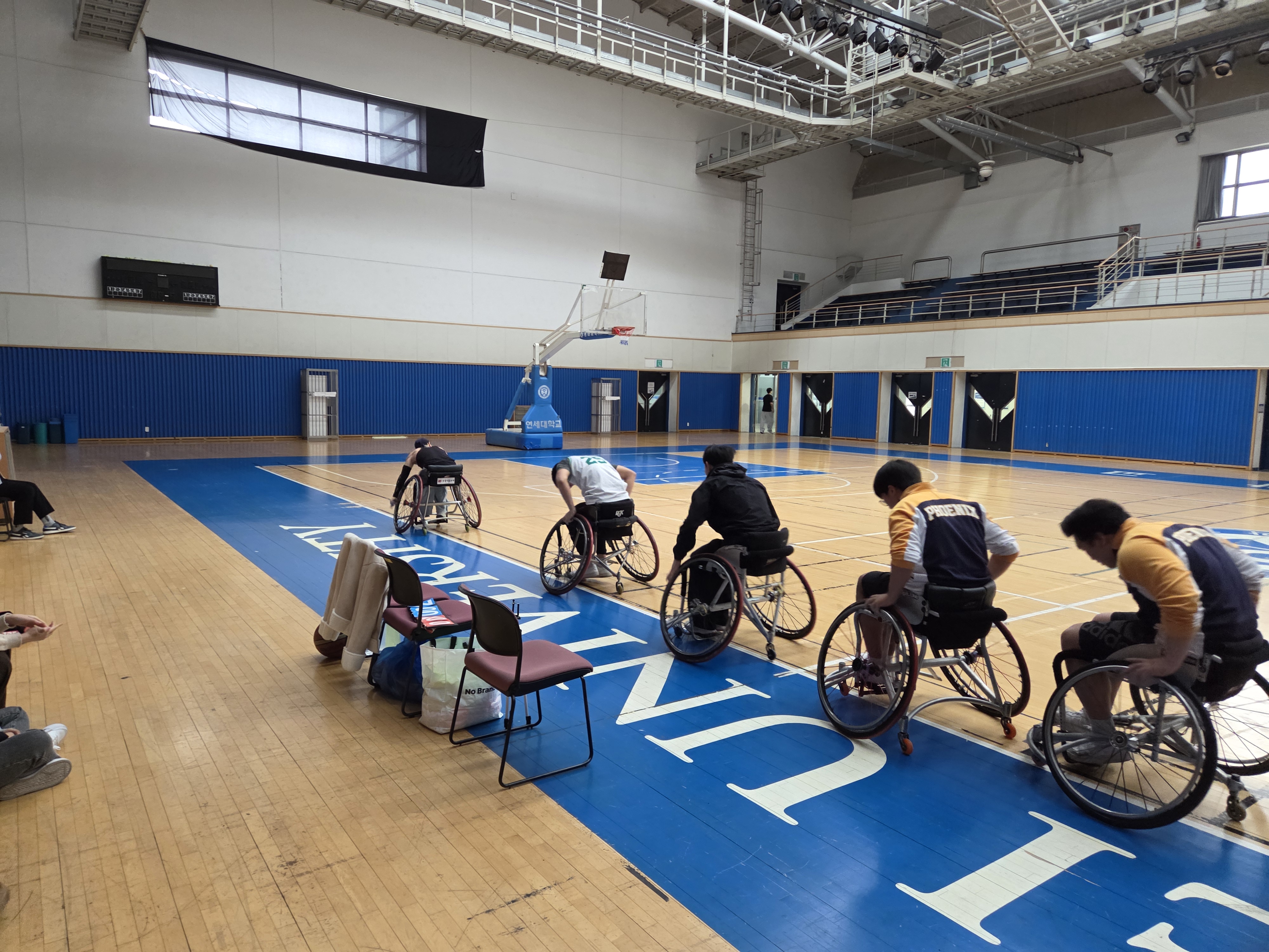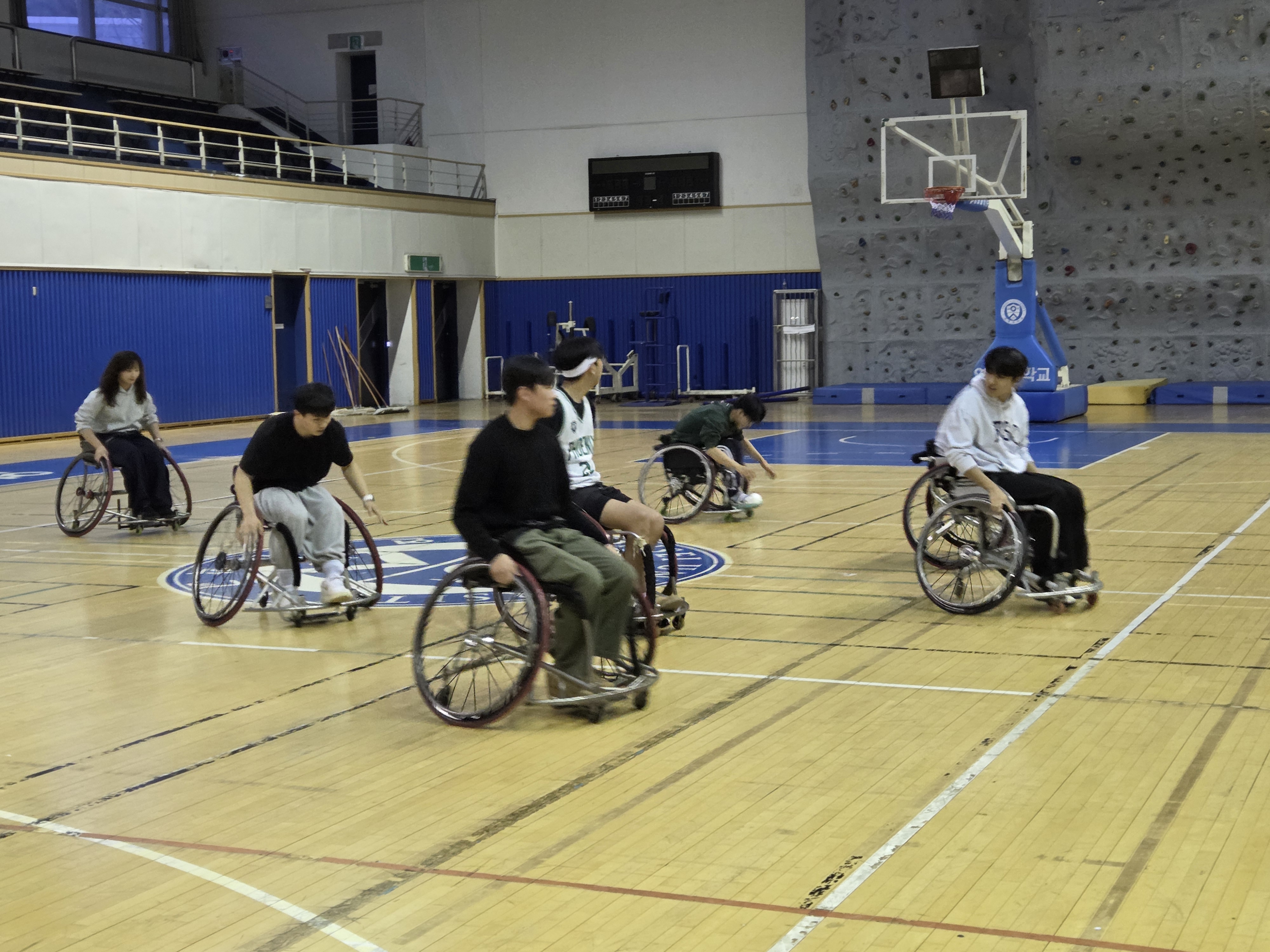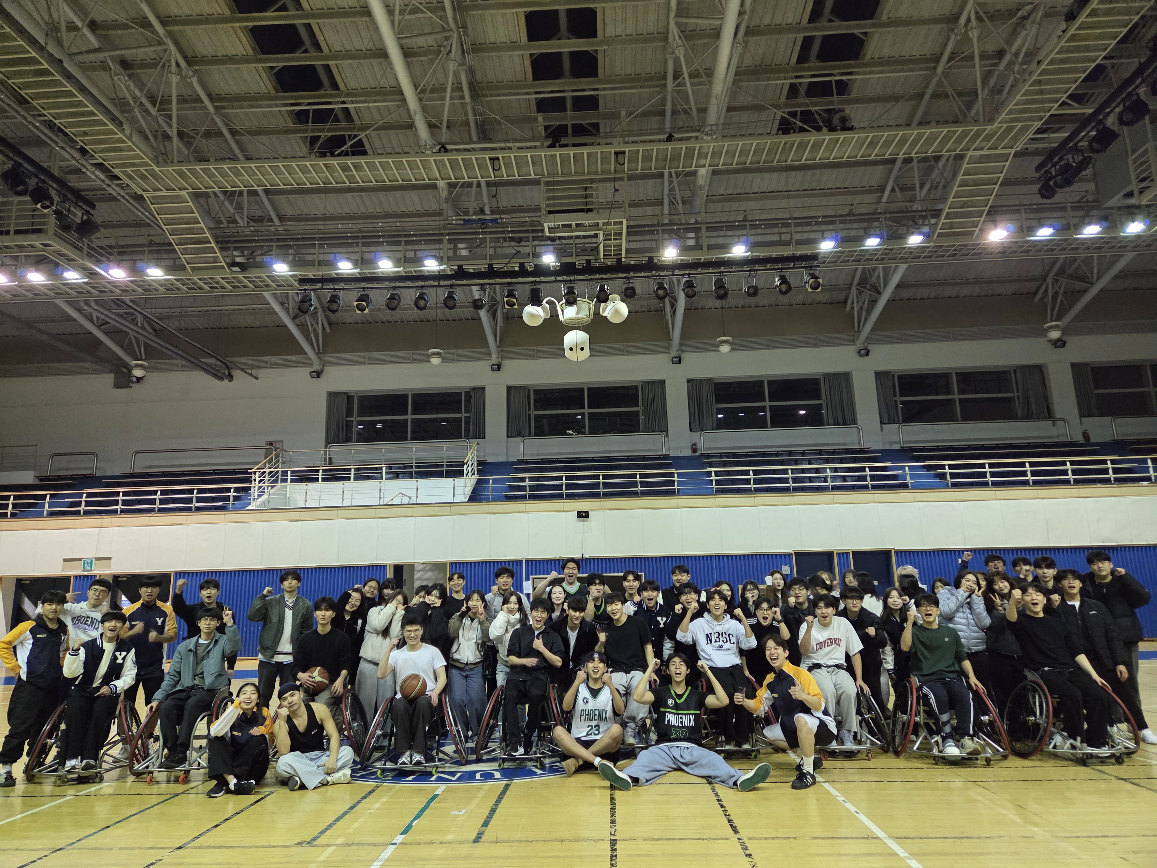일시: 2026.03.05 장소: 스포츠센터 신입생들이 휠체어 농구를 직접 보고 체험해볼 수 있도록 공개훈련을 진행했습니다. 휠체어 농구 소모임인 '피닉스'에서 하는 훈련과 경기를 직접 관람한 뒤, 휠체어를 타고 공을 다뤄보며 휠체어 농구만의 매력을 느껴보는 시간을 가졌습니다. 또한 장애인 스포츠를 자연스럽게 경험하며, 장애인 스포츠에 대한 이해와 관심을 넓히는 의미 있는 시간이 되었습니다.