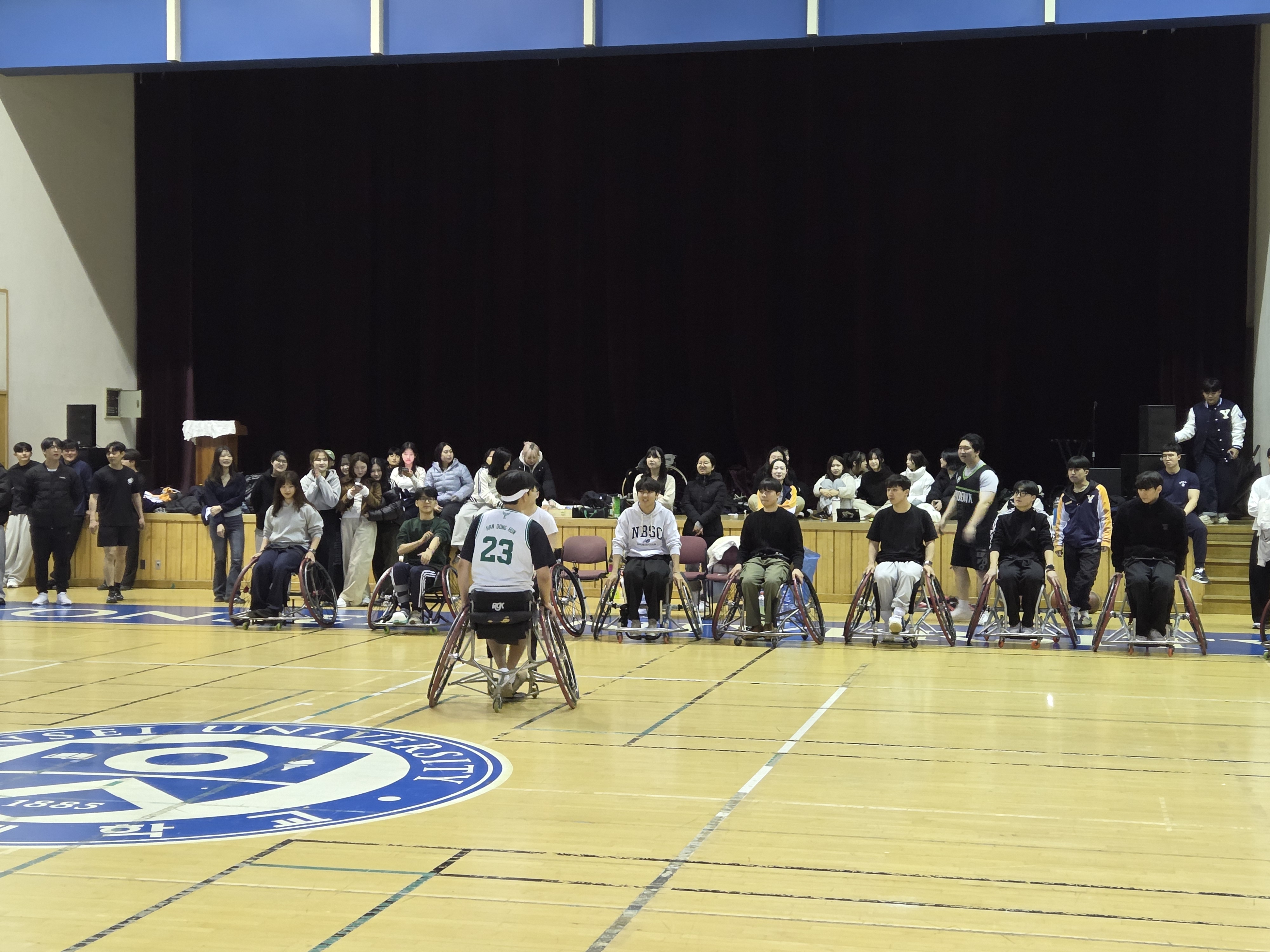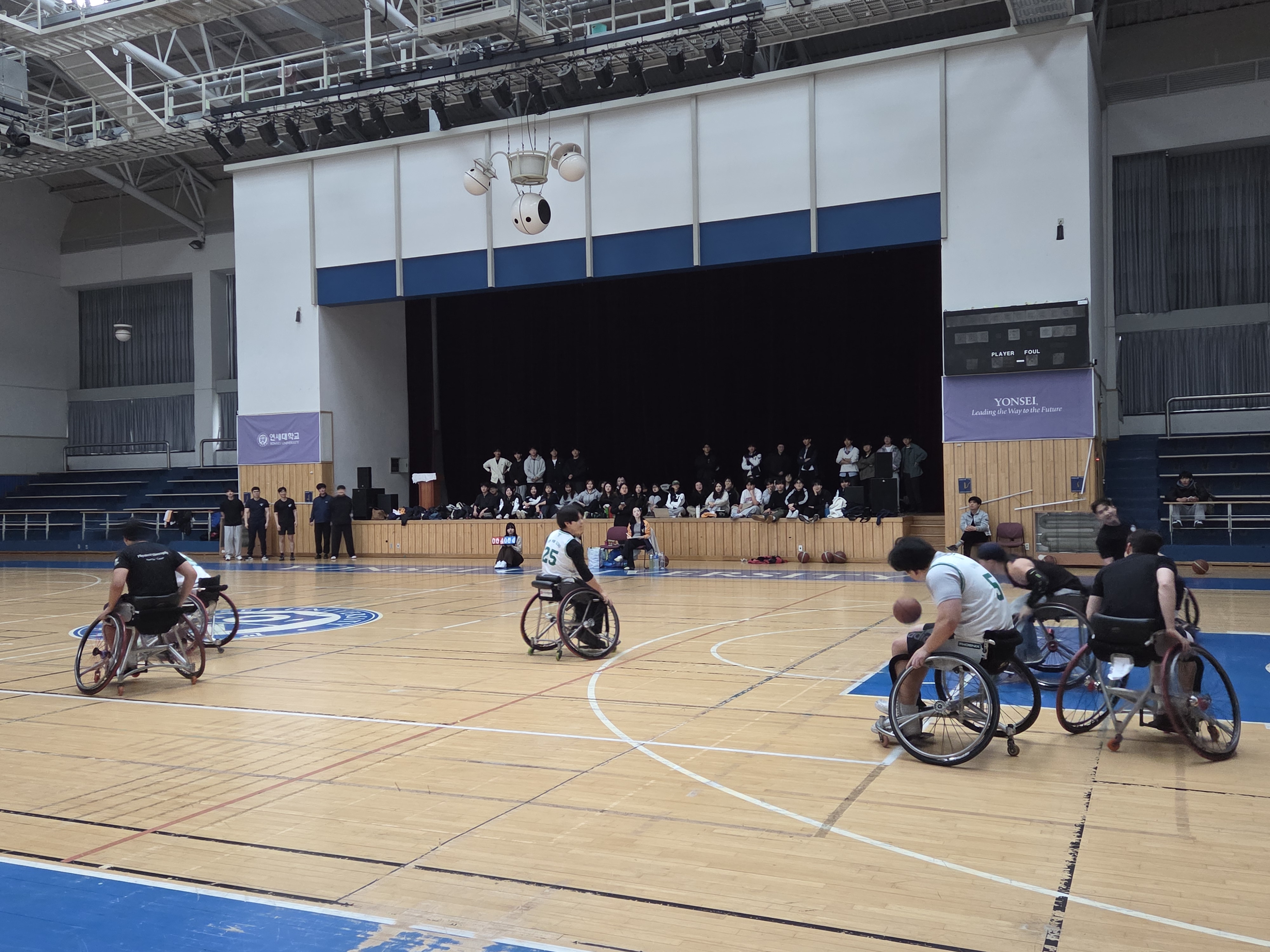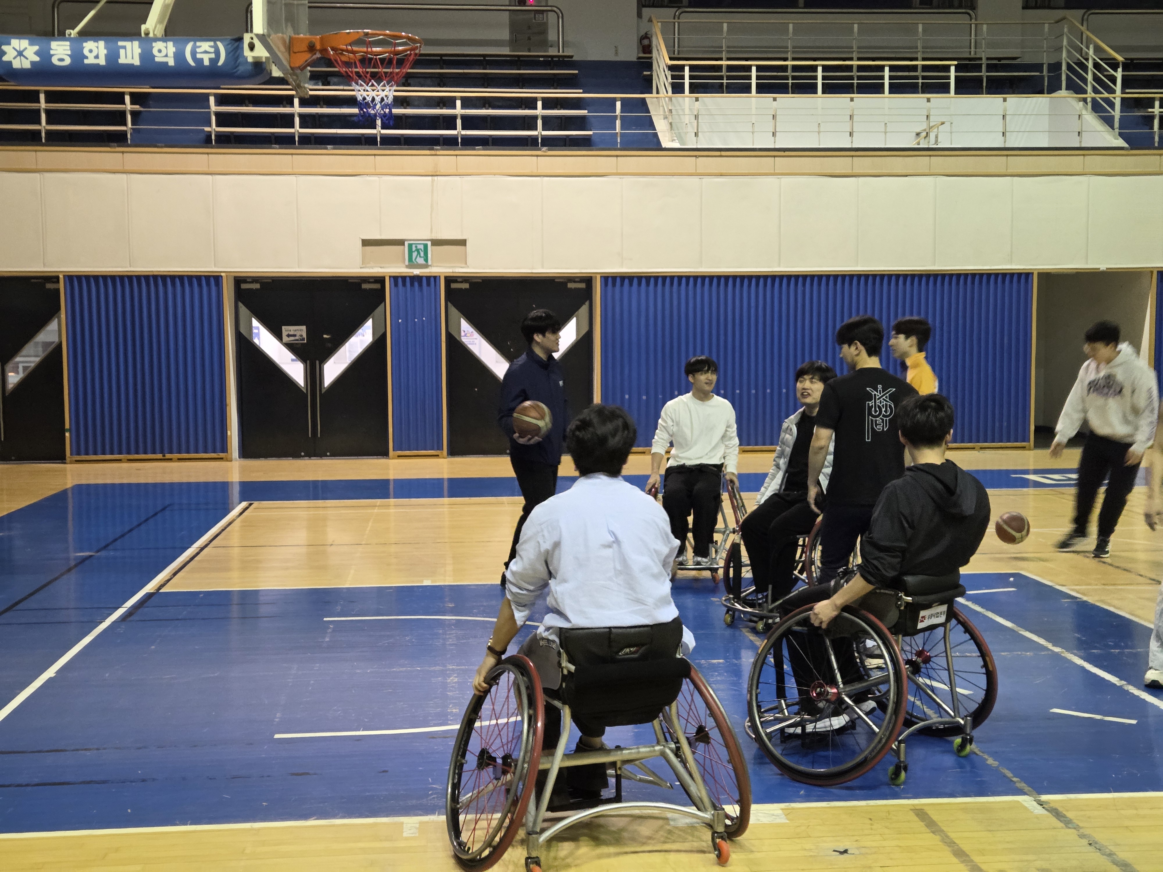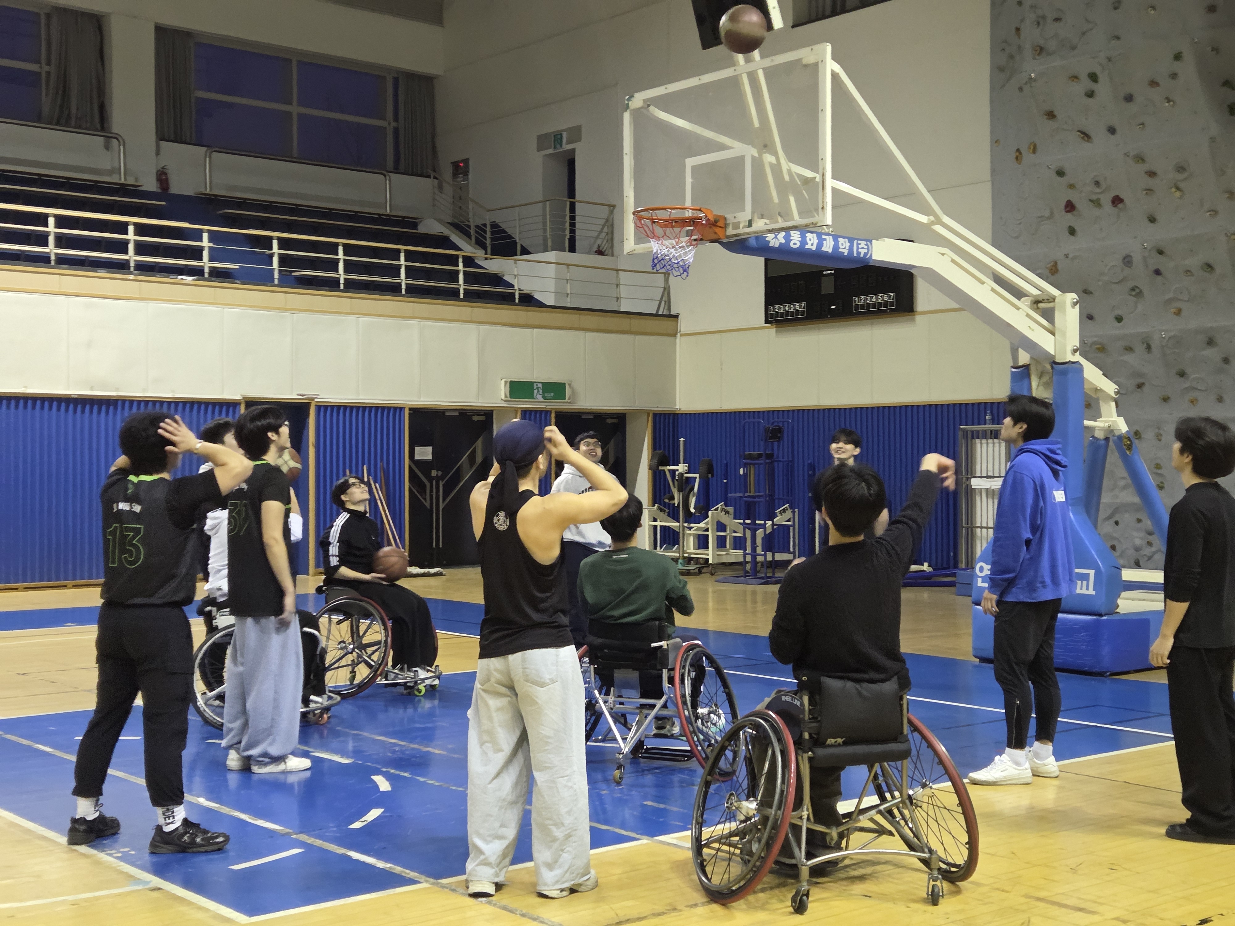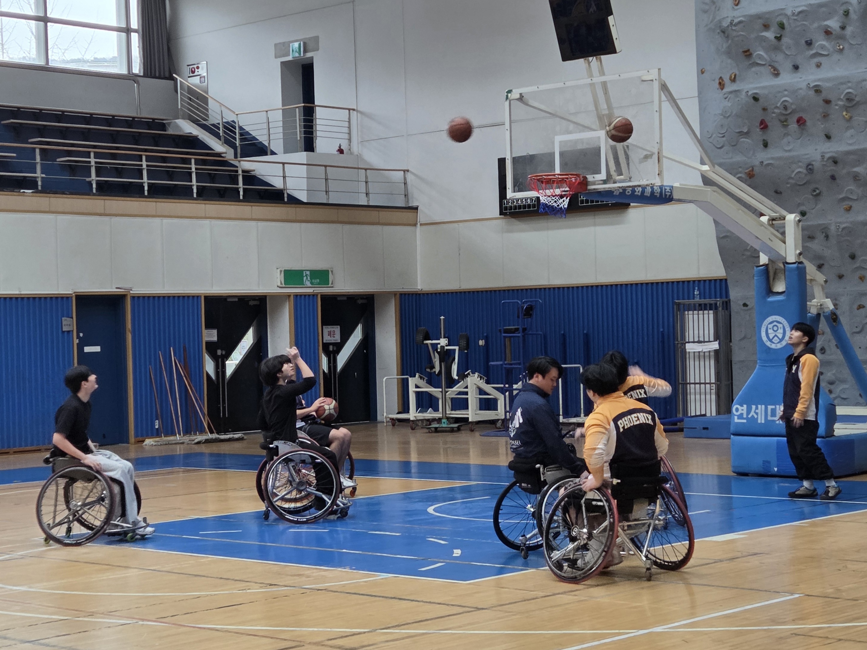 일시: 2026.03.05 장소: 스포츠센터 신입생들이 휠체어 농구를 직접 보고 체험해볼 수 있도록 공개훈련을 진행했습니다. 휠체어 농구 소모임인 '피닉스'에서 하는 훈련과 경기를 직접 관람한 뒤, 휠체어를 타고 공을 다뤄보며 휠체어 농구만의 매력을 느껴보는 시간을 가졌습니다. 또한 장애인 스포츠를 자연스럽게 경험하며, 장애인 스포츠에 대한 이해와 관심을 넓히는 의미 있는 시간이 되었습니다.