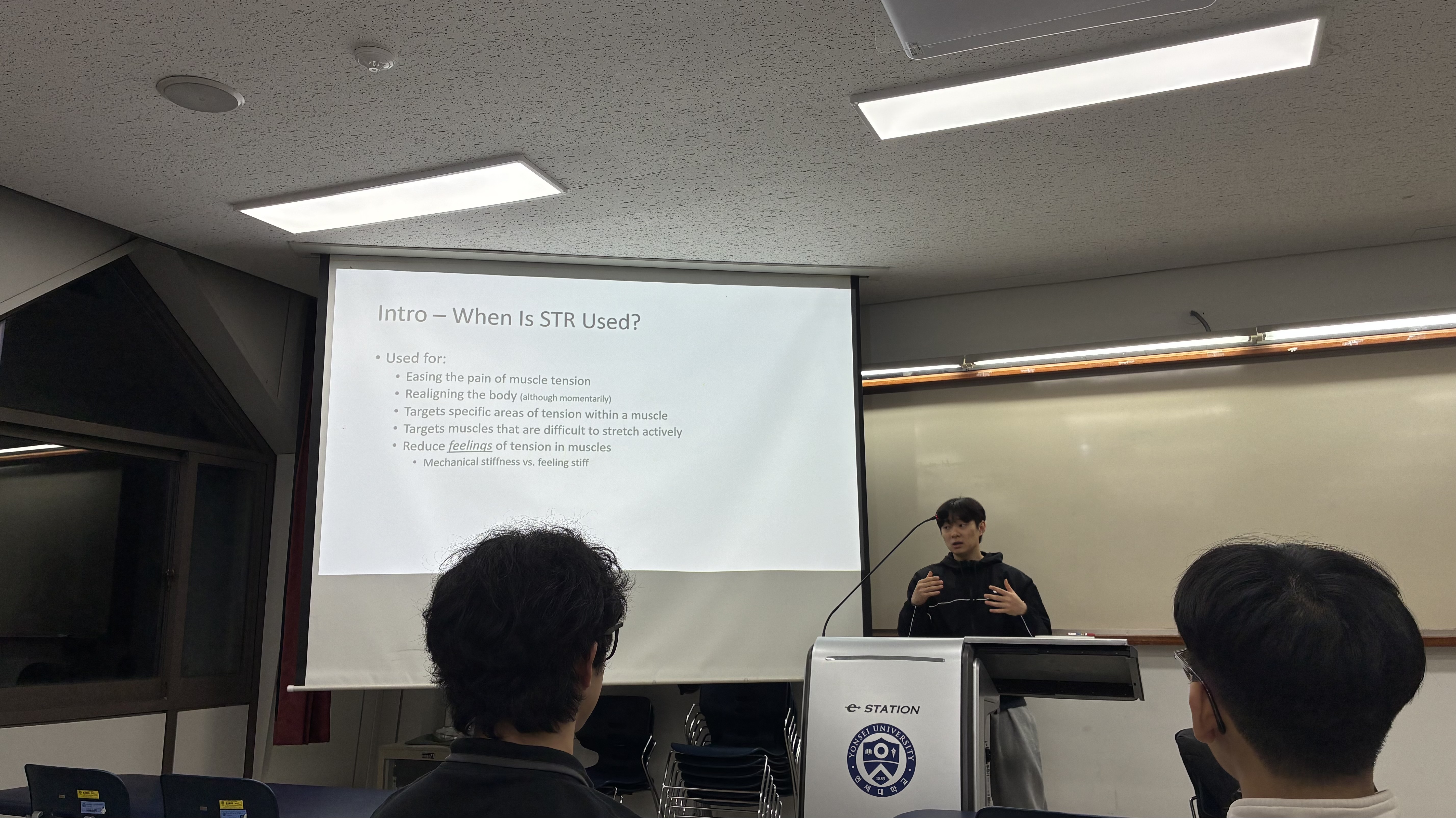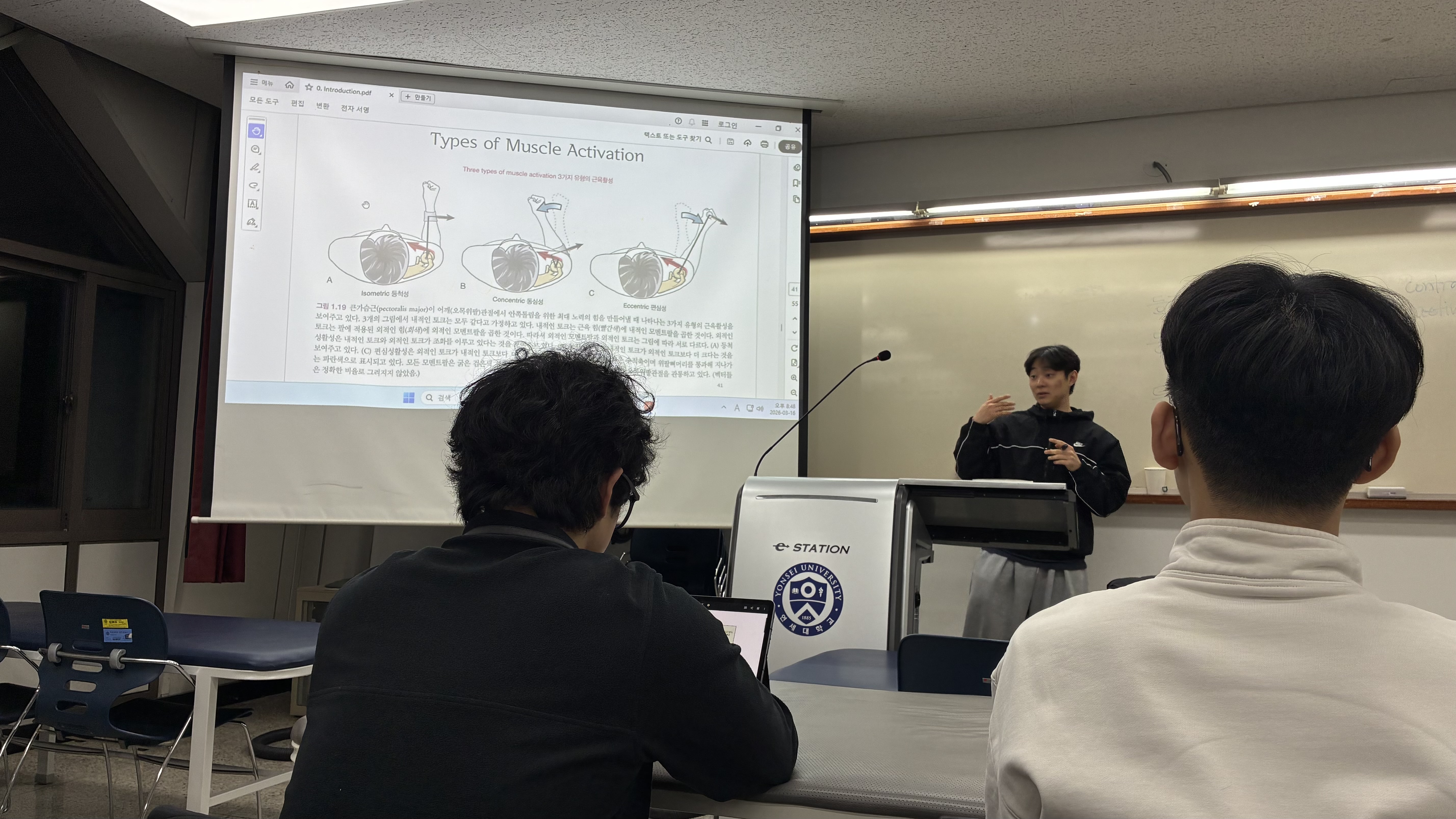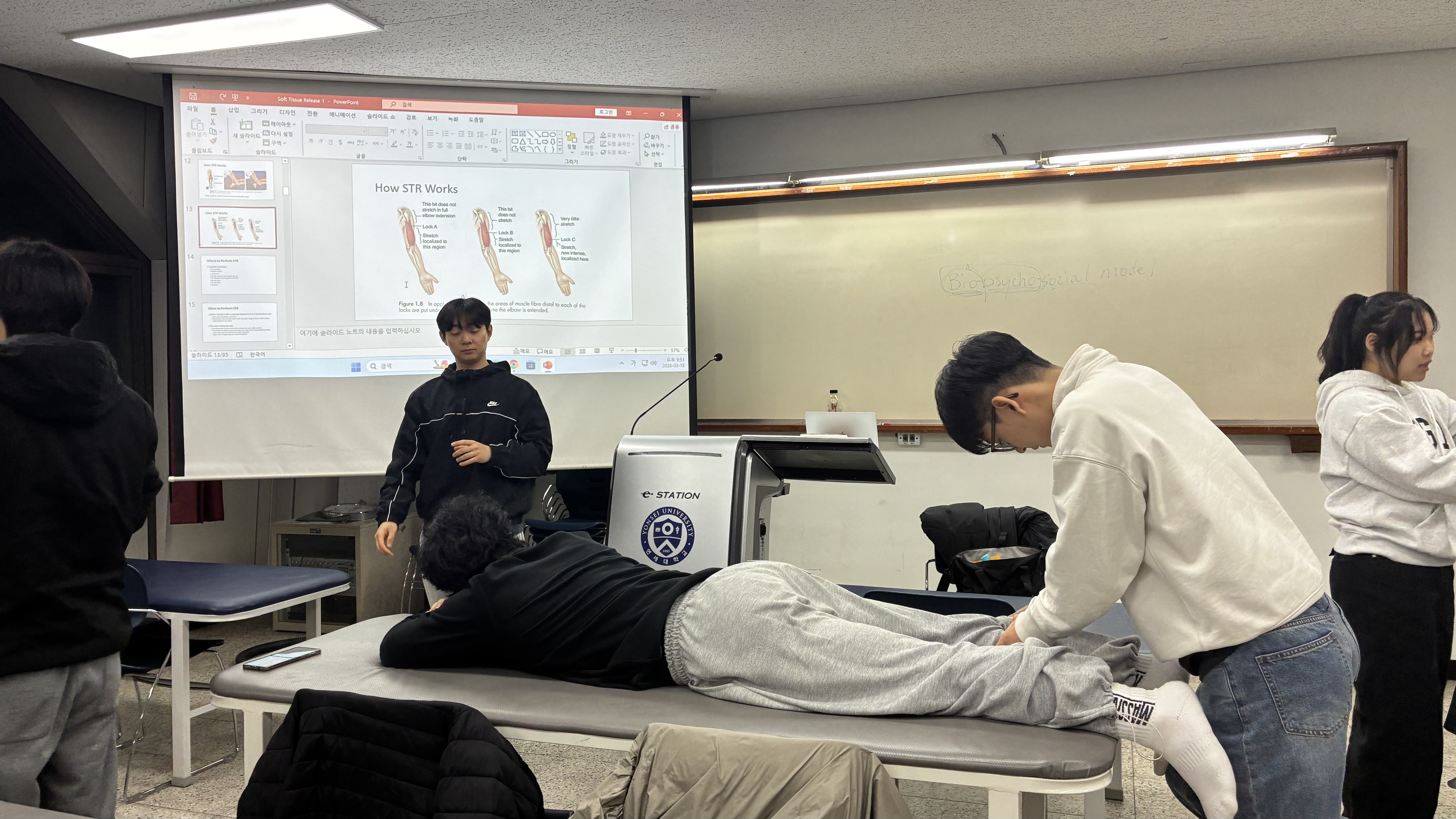 일시: 2026/03/16 장소: 백운관 516호 물리치료학과 스포츠물리치료학 소모임 AXIS 개강총회 및 첫 주모임 진행했습니다. 이번 학기는 soft tissue release(STR)를 같이 공부해보는 시간이 될 것이기 때문에 그 전에 필요한 필수 개념들을 먼저 짚고 STR에 대해 간단히 소개하는 시간을 가졌습니다.