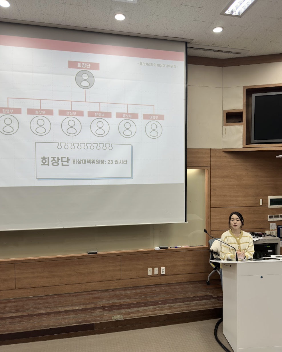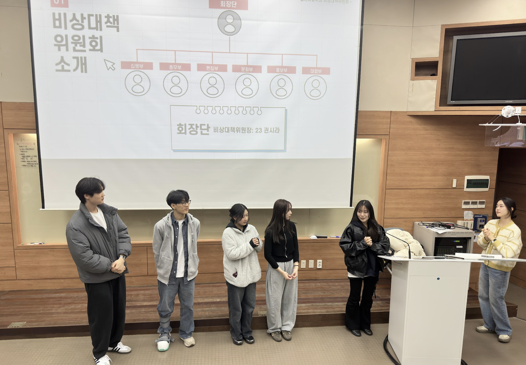 일시 : 2026/03/09 장소 : 백운관 26학년도 학생회 개강총회를 진행하였습니다. 이번 학생회 개강총회에서는 비상대책위원회 기반을 설명하고, 신입 부원들을 맞이하는 시간을 가졌습니다. 신입 학생회 부원들을 진심으로 환영합니다.